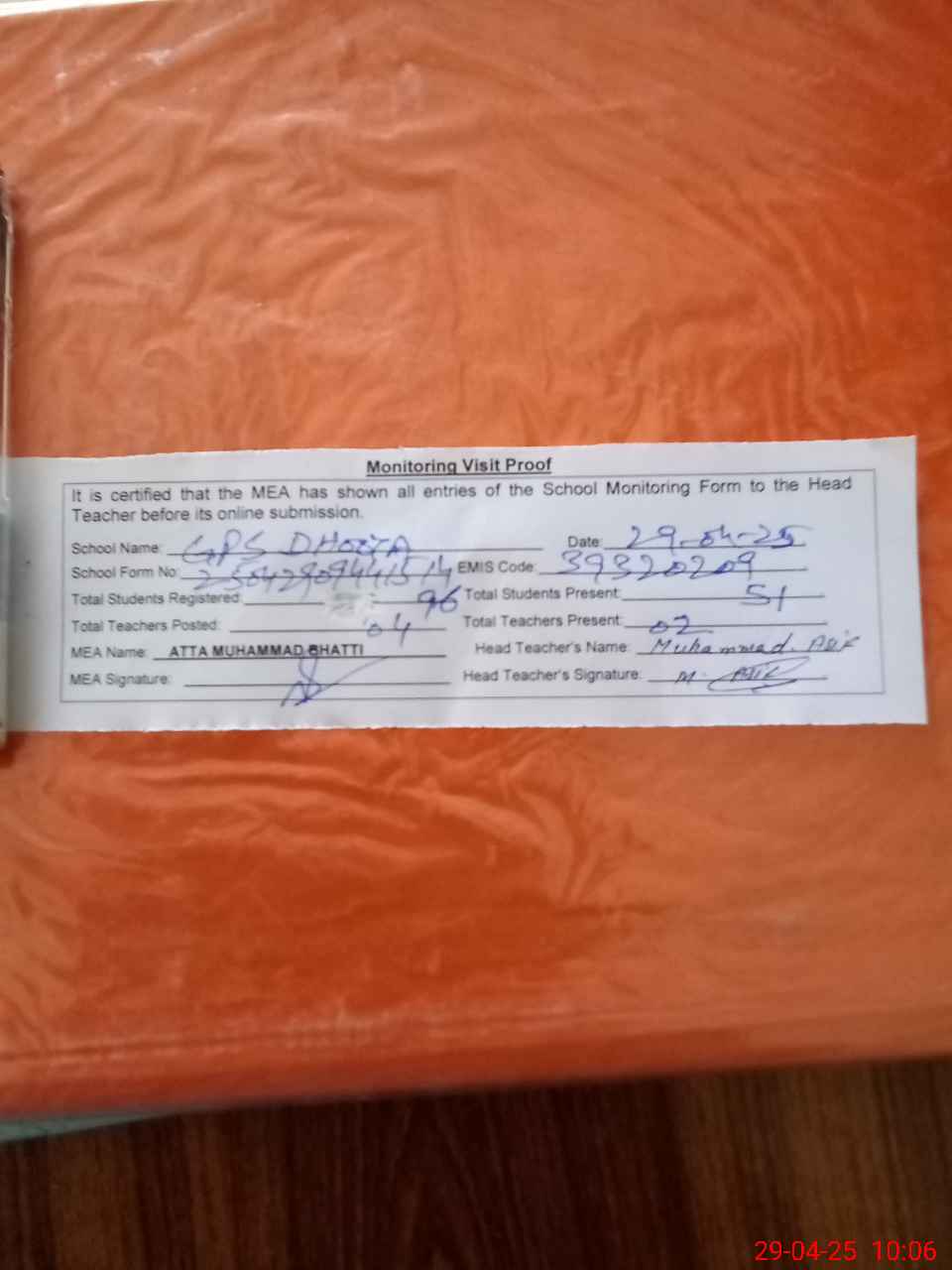 | Attendance Register | Head Teacher | MEA with School | Visit Proof |