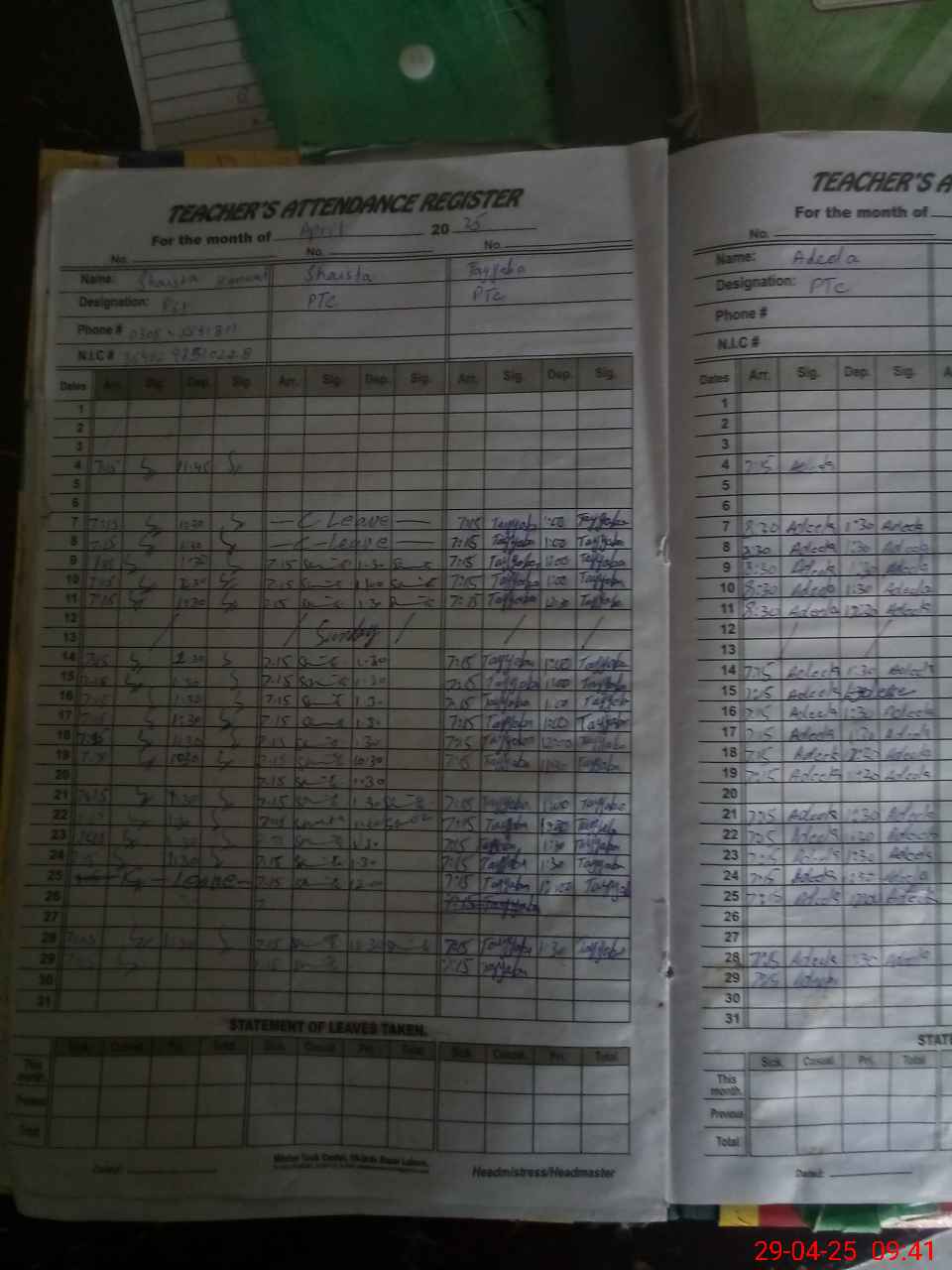 | CNIC | Full Name | Designation | R/C | Absence During Last Calender Month |