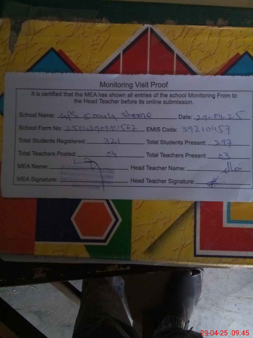 | Attendance Register | Head Teacher | MEA with School | Visit Proof |