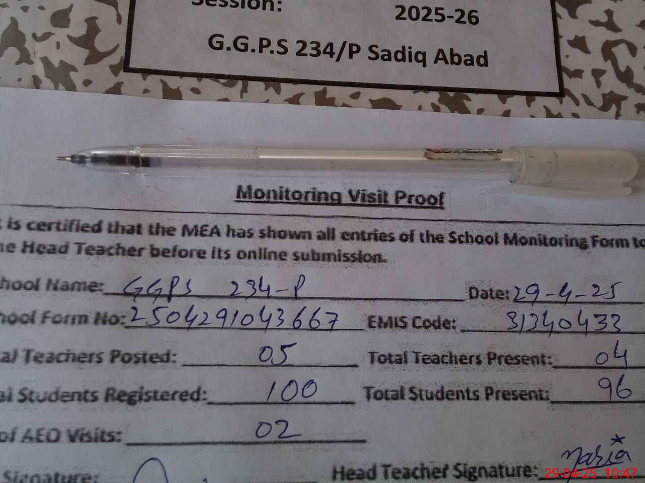 | Attendance Register | Head Teacher | MEA with School | Visit Proof |