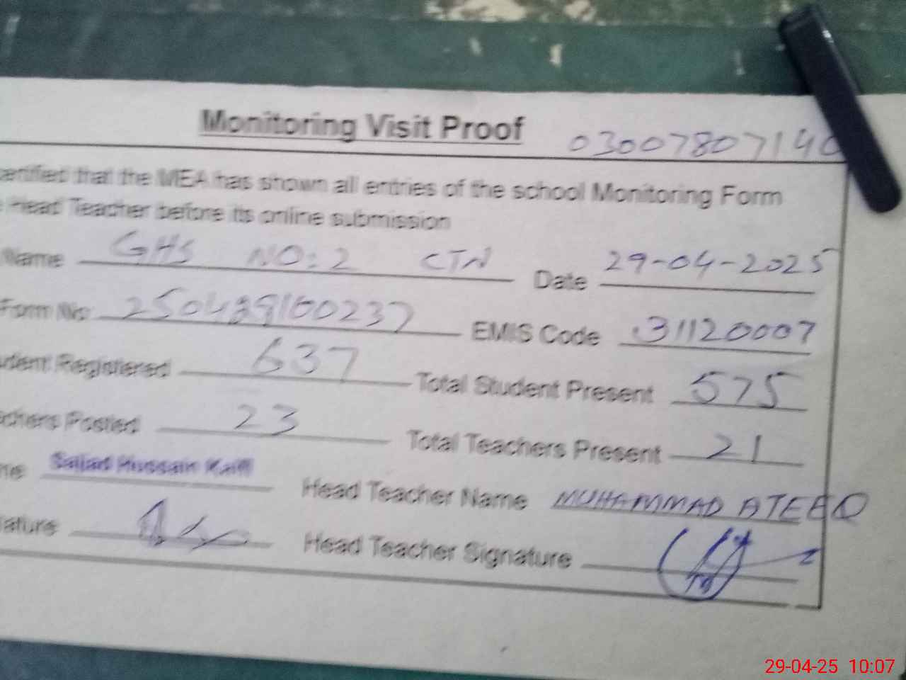 | Attendance Register | Head Teacher | MEA with School | Visit Proof |