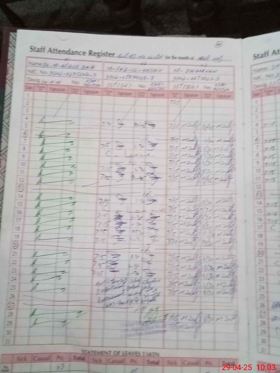| CNIC | Full Name | Designation | R/C | Absence During Last Calender Month |