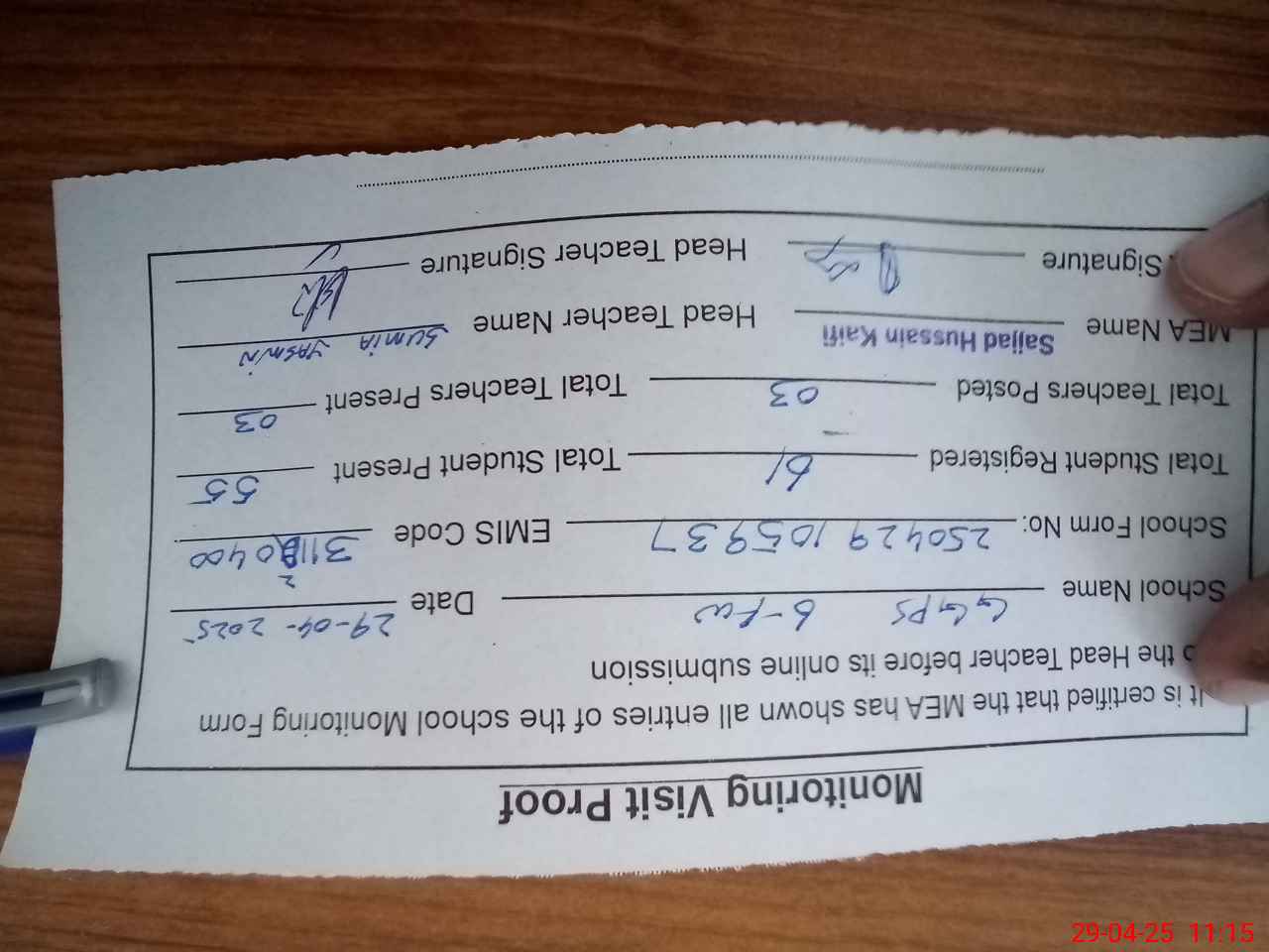 | Attendance Register | Head Teacher | MEA with School | Visit Proof |