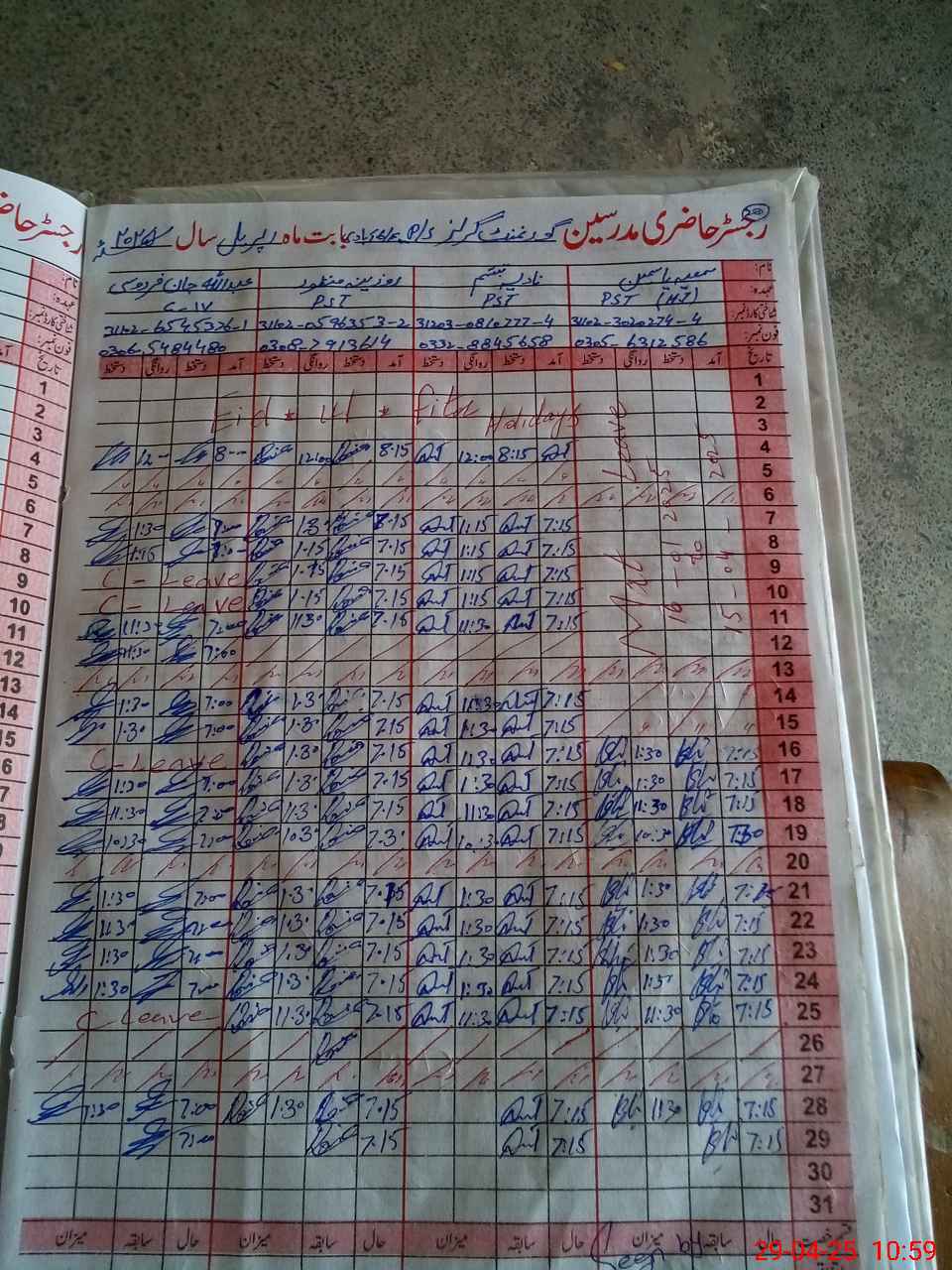 | CNIC | Full Name | Designation | R/C | Absence During Last Calender Month |