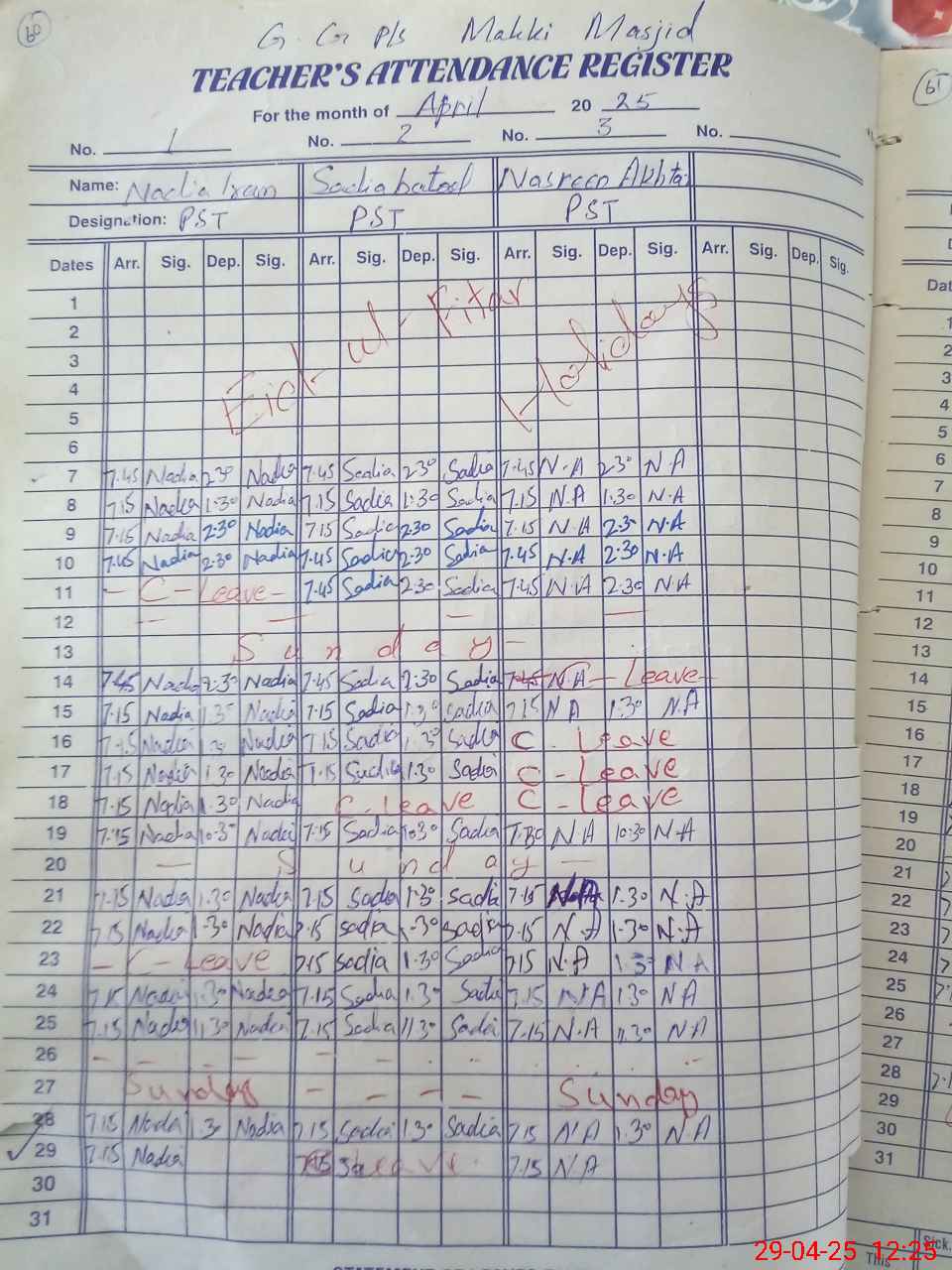 | CNIC | Full Name | Designation | R/C | Absence During Last Calender Month |