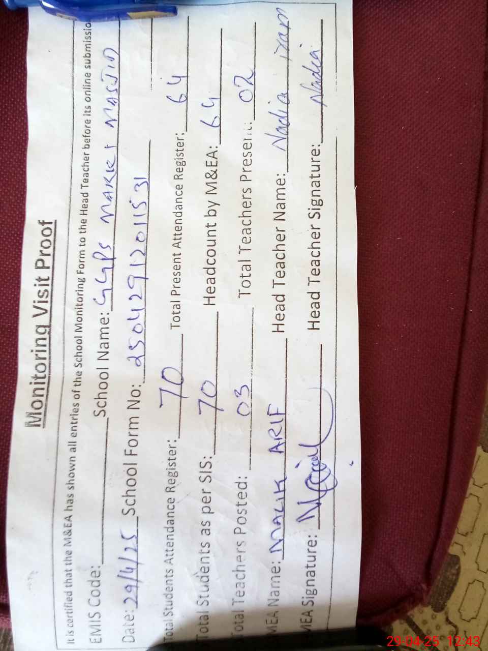 | Attendance Register | Head Teacher | MEA with School | Visit Proof |