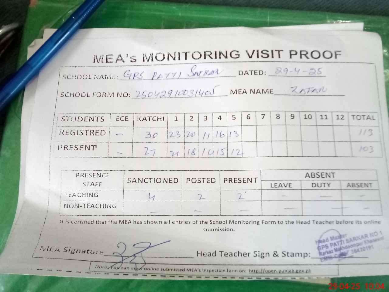 | Attendance Register | Head Teacher | MEA with School | Visit Proof |