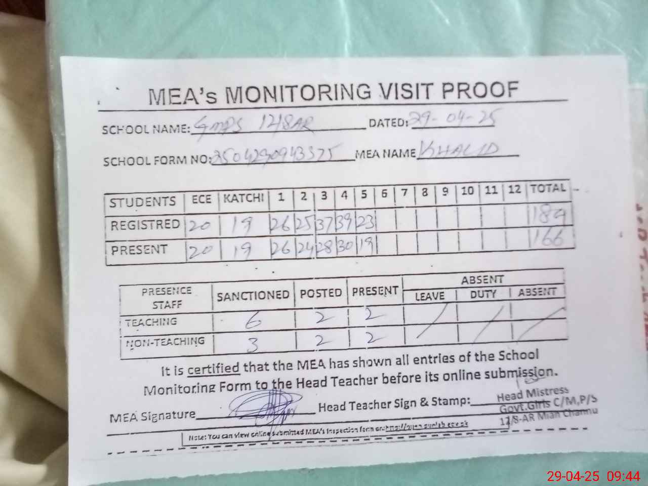 | Attendance Register | Head Teacher | MEA with School | Visit Proof |