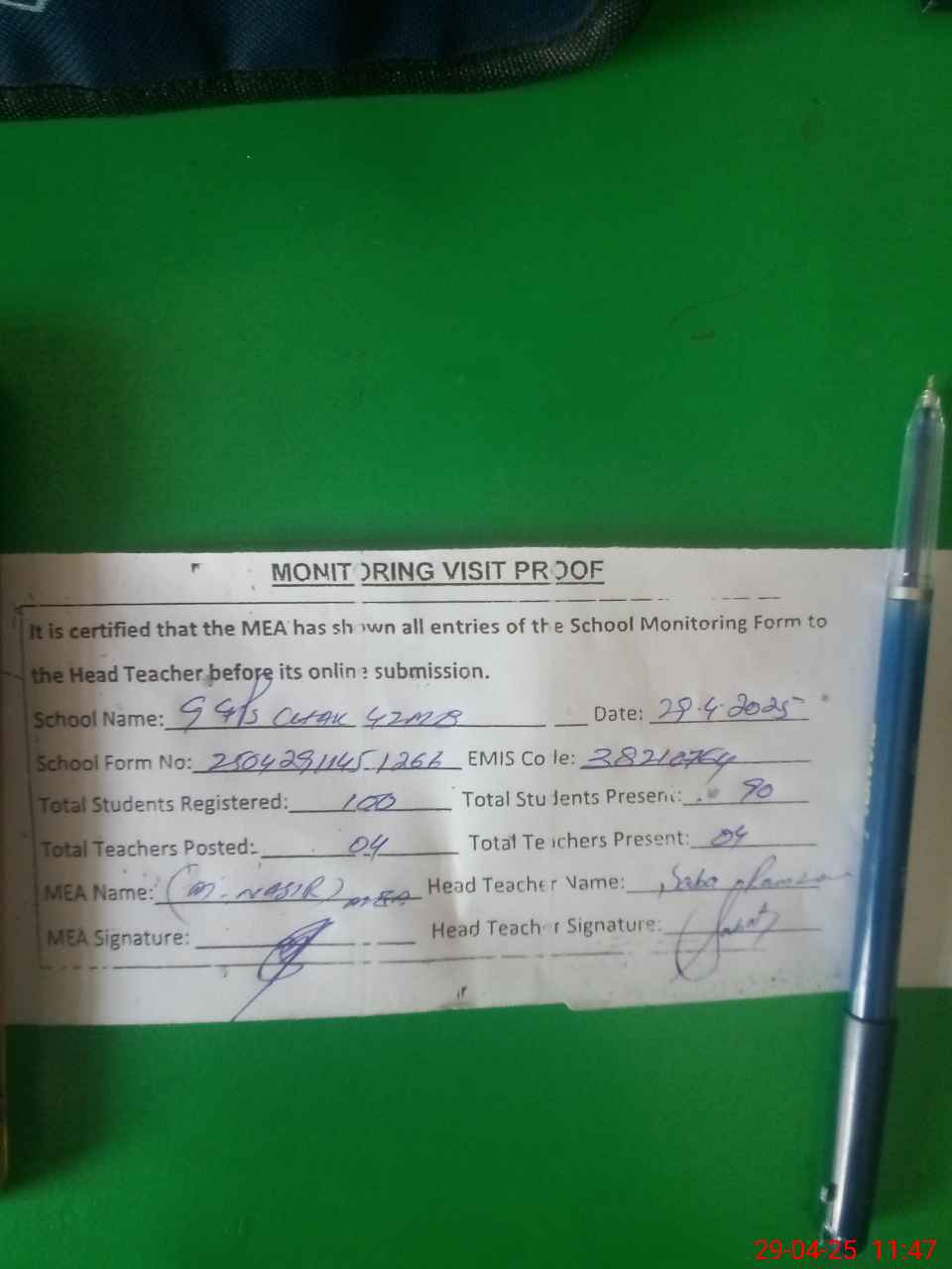 | Attendance Register | Head Teacher | MEA with School | Visit Proof |