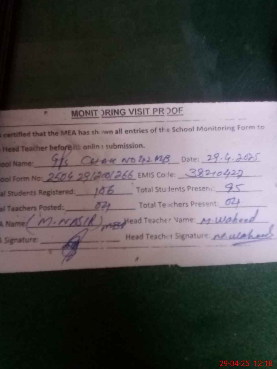 | EMIS Code: 38210427 | Name of School: GPS CHAK NO. 42 MB | |||