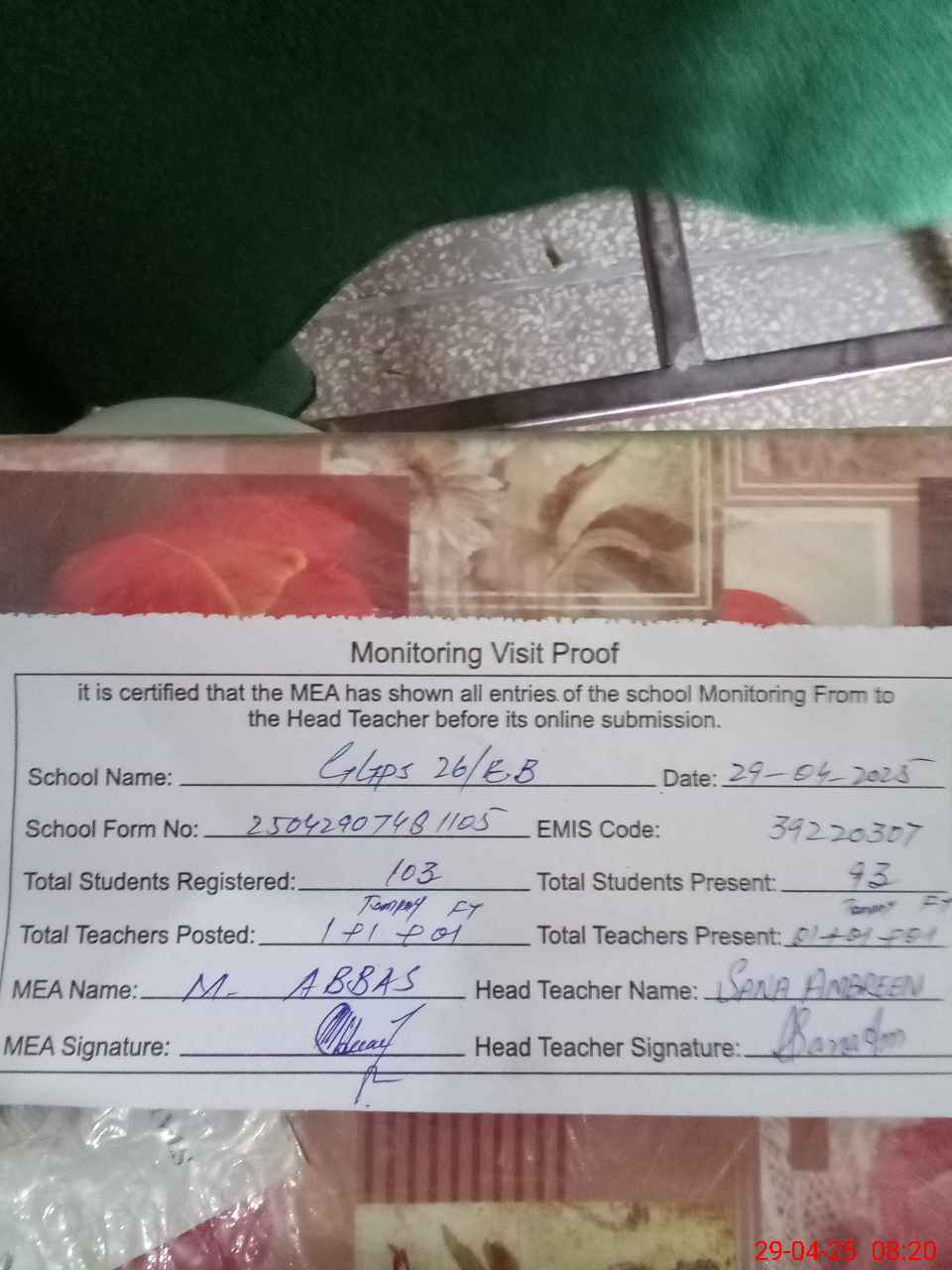 | Attendance Register | Head Teacher | MEA with School | Visit Proof |