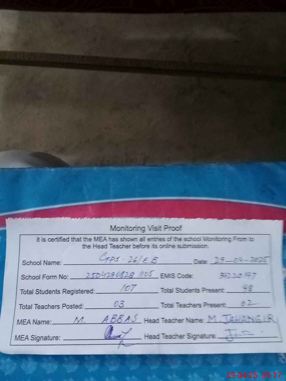| Attendance Register | Head Teacher | MEA with School | Visit Proof |