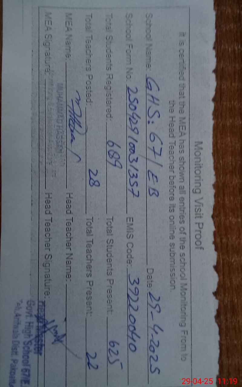 | EMIS Code: 39220040 | Name of School: GHS 67 EB | |||