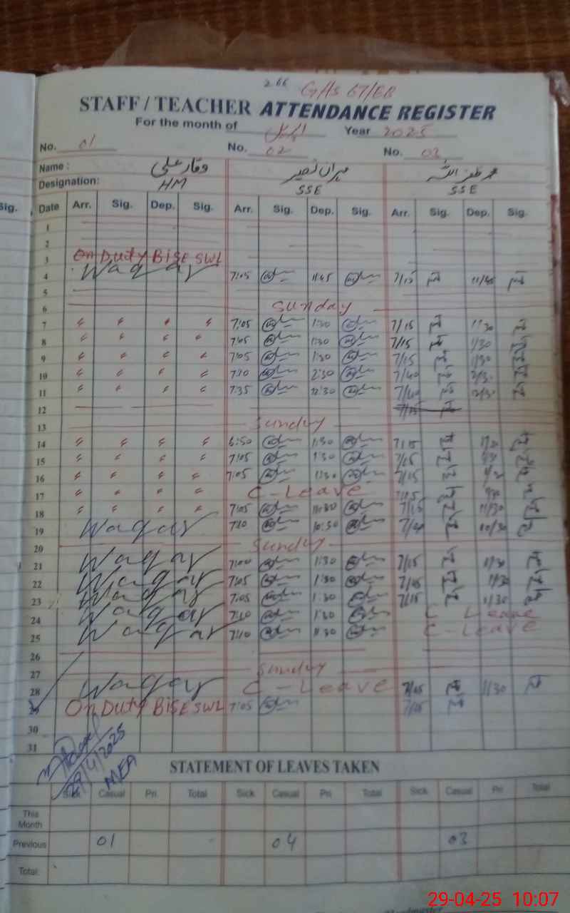 | 36**** | Wa**** Al**** | HEADMASTER | Contract | 0 | 0 | 0 | 0 | 0 | 0 | 0 | 0 | 0 | Exam Duty |