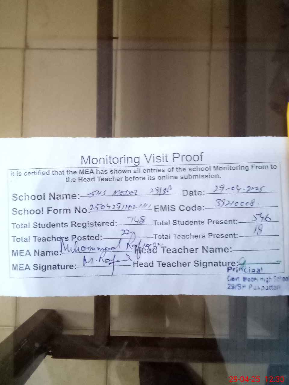 | EMIS Code: 39210008 | Name of School: GHS MODEL 29/SP PAKPATAN | |||