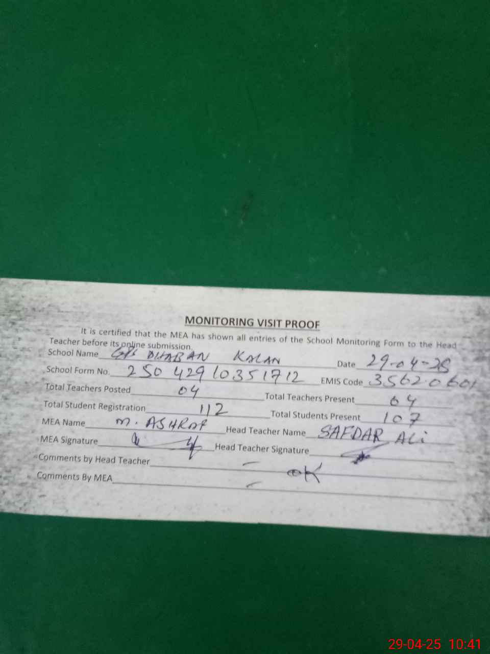 | Attendance Register | Head Teacher | MEA with School | Visit Proof |