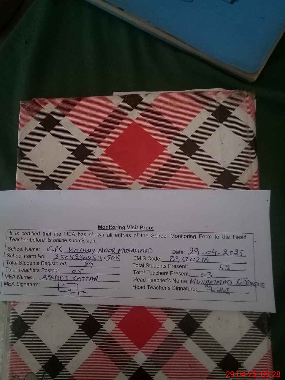 | Attendance Register | Head Teacher | MEA with School | Visit Proof |