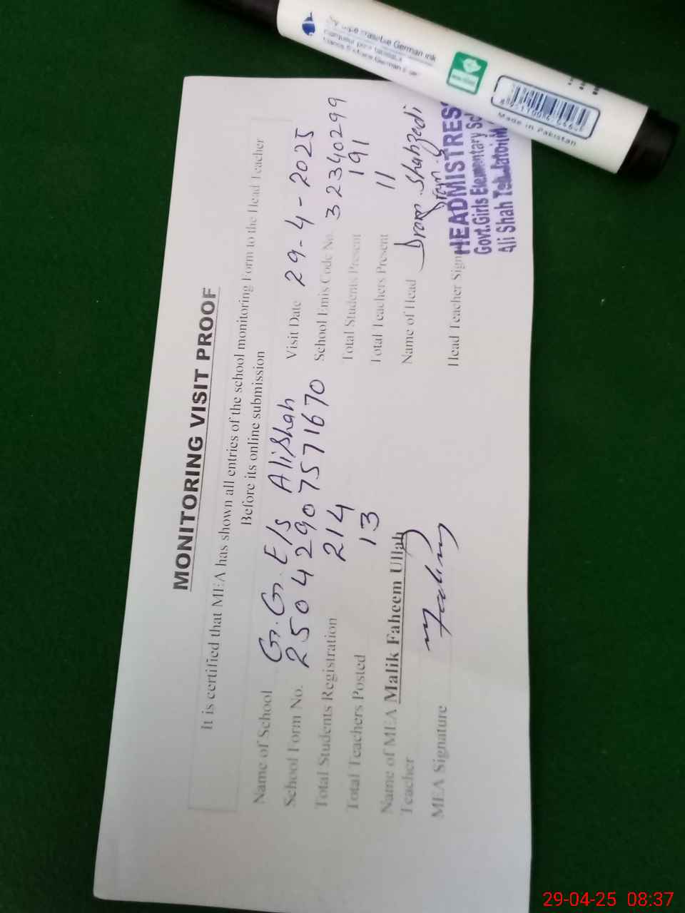 | Attendance Register | Head Teacher | MEA with School | Visit Proof |
