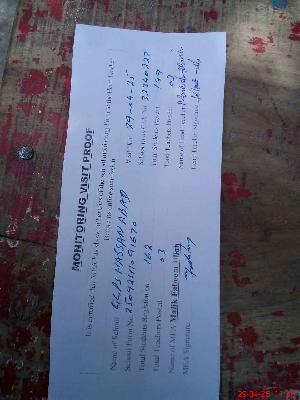 | Attendance Register | Head Teacher | MEA with School | Visit Proof |