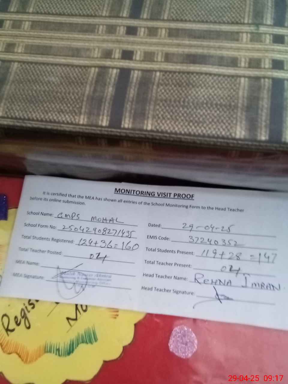 | EMIS Code: 37240352 | Name of School: GMPS MOHAL | |||