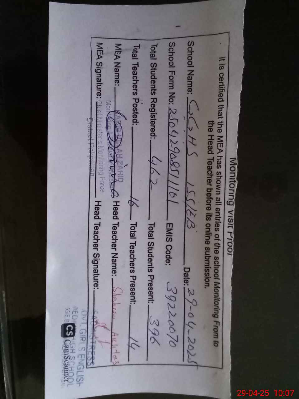 | Certified that this School was Inspected by the Undersigned MEA/DMO Today and the Information Stated Above is as Per Record. | |||||