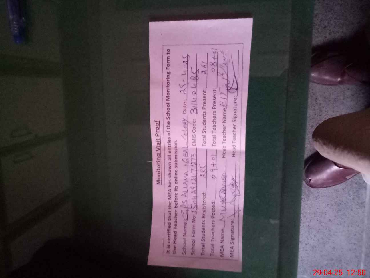 | Attendance Register | Head Teacher | MEA with School | Visit Proof |