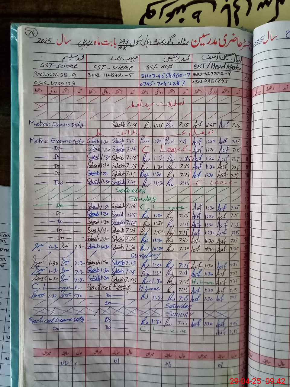 | 31**** | So**** Ah**** | 5 | 1 | 0 | 0 | 0 | 0 | 0 | 0 | 0 | 0 | 0 | Exam Duty |