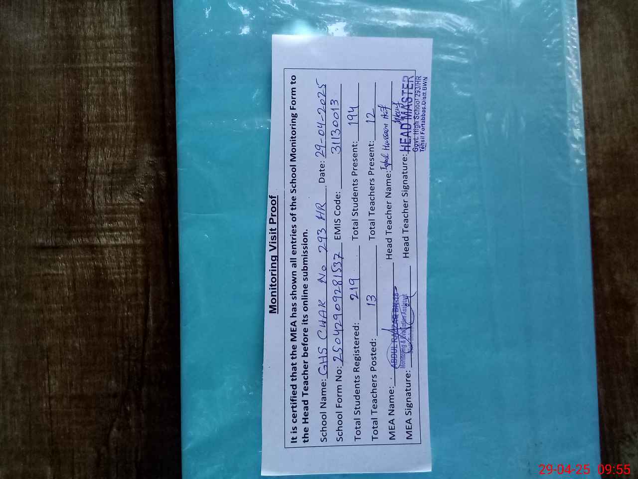 | Attendance Register | Head Teacher | MEA with School | Visit Proof |