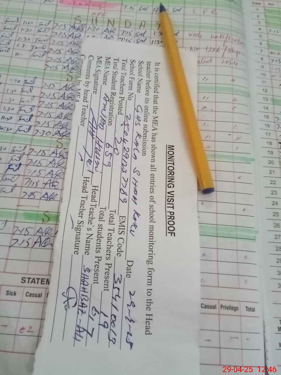 | Attendance Register | Head Teacher | MEA with School | Visit Proof |