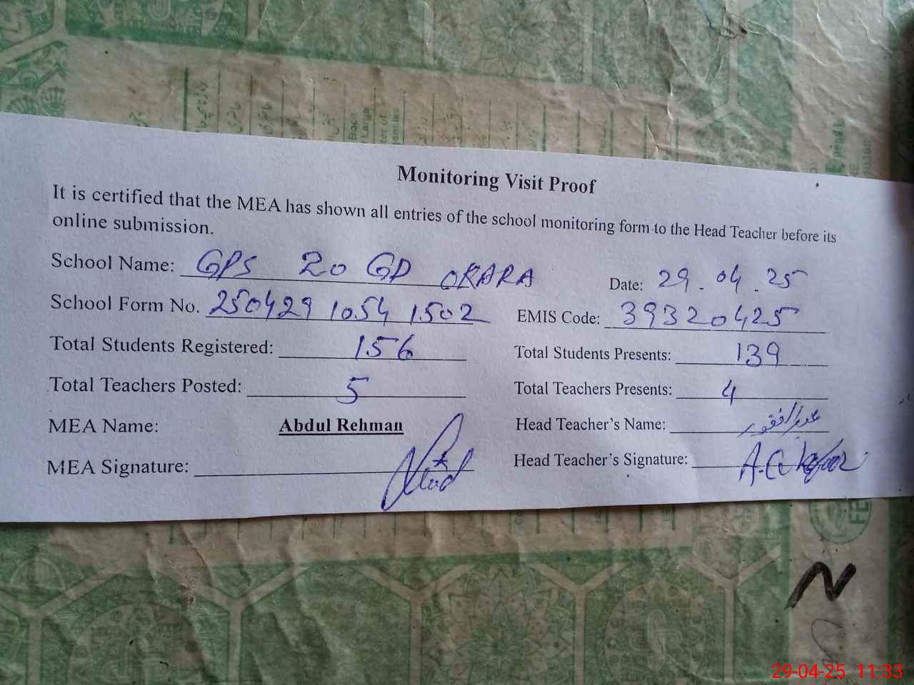 | EMIS Code: 39320425 | Name of School: GPS CHAK NO. 20/G.D | |||