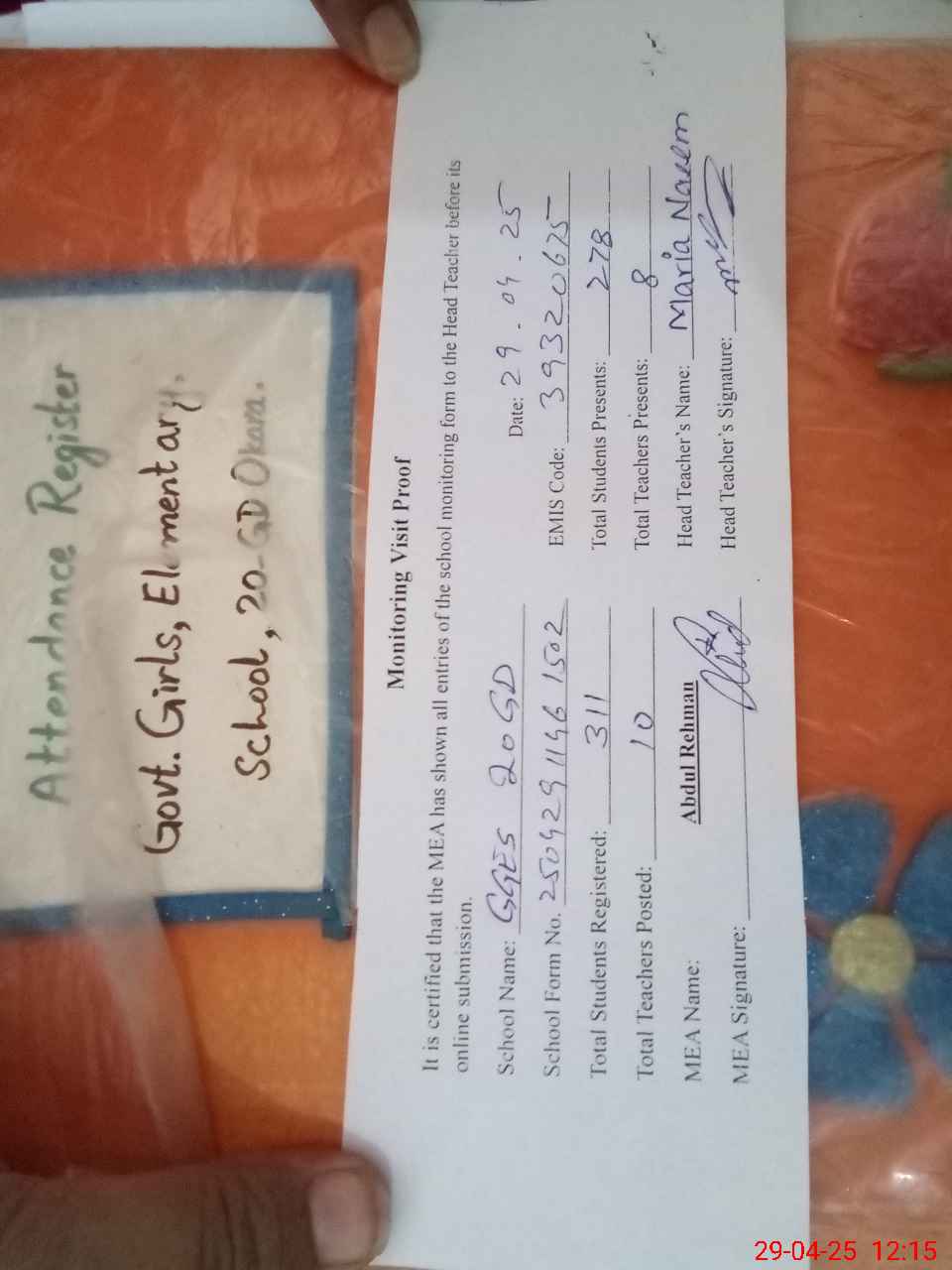 | Attendance Register | Head Teacher | MEA with School | Visit Proof |
