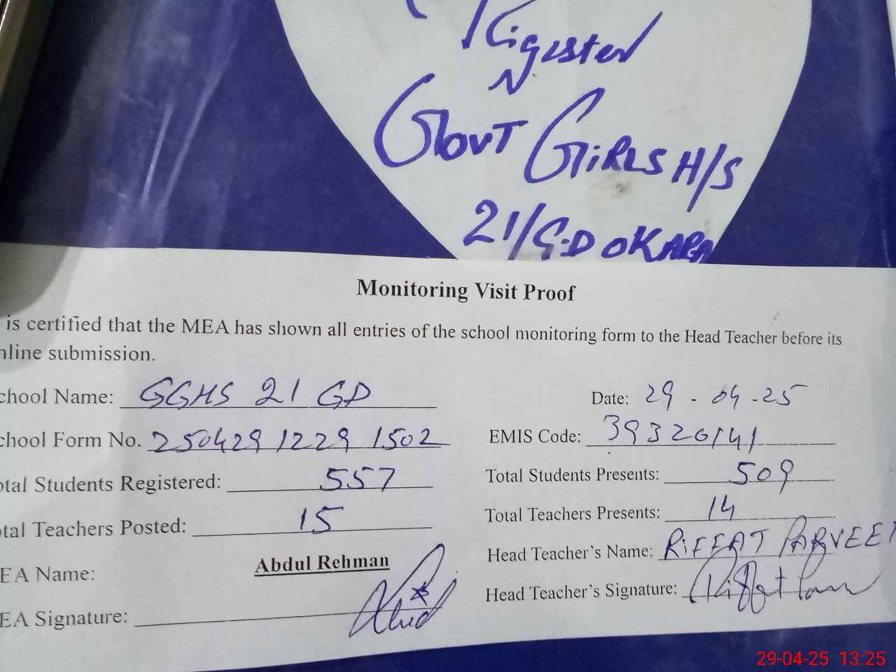 | Attendance Register | Head Teacher | MEA with School | Visit Proof |