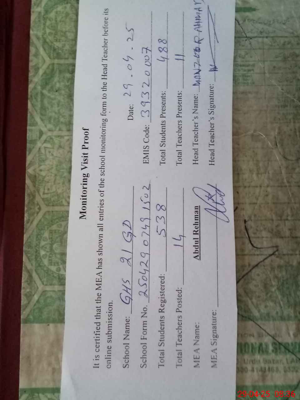 | Attendance Register | Head Teacher | MEA with School | Visit Proof |