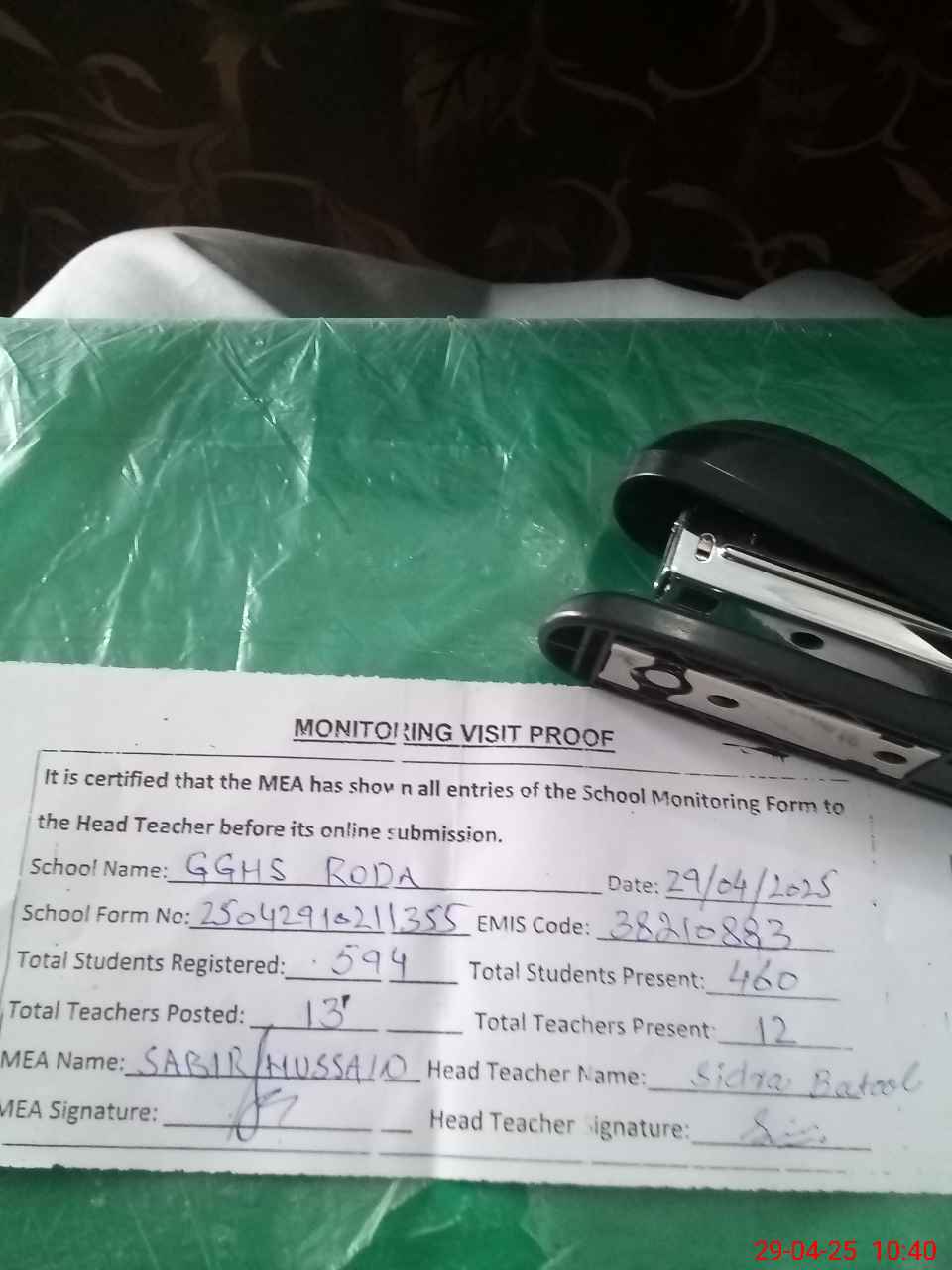 | Attendance Register | Head Teacher | MEA with School | Visit Proof |