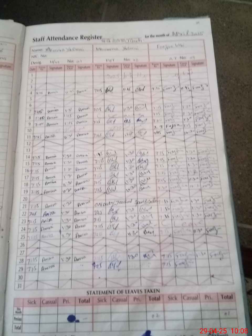 | CNIC | Full Name | Designation | R/C | Absence During Last Calender Month |