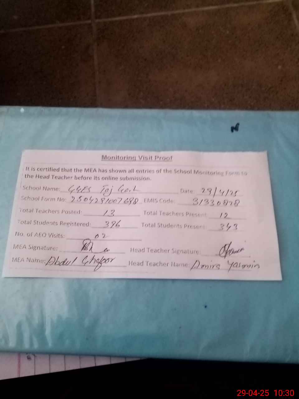 | Attendance Register | Head Teacher | MEA with School | Visit Proof |
