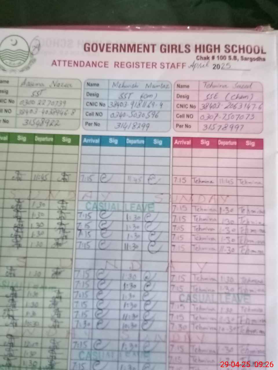 | CNIC | Full Name | Designation | R/C | Absence During Last Calender Month |