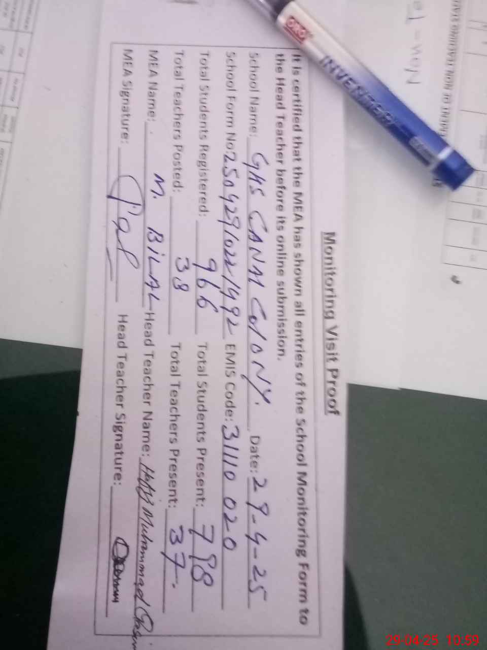 | Attendance Register | Head Teacher | MEA with School | Visit Proof |