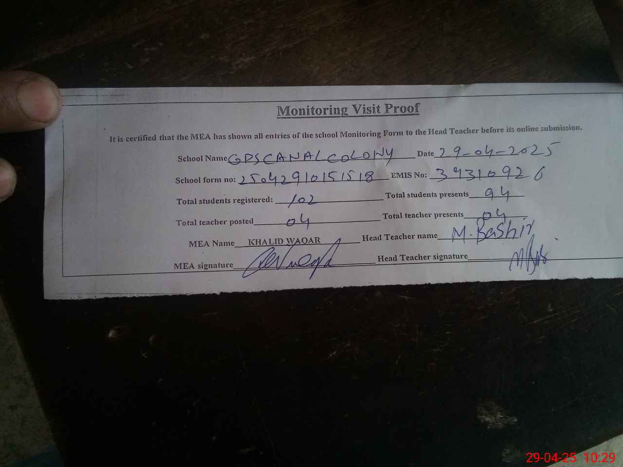 | EMIS Code: 39310926 | Name of School: GPS CANAL COLONY | |||