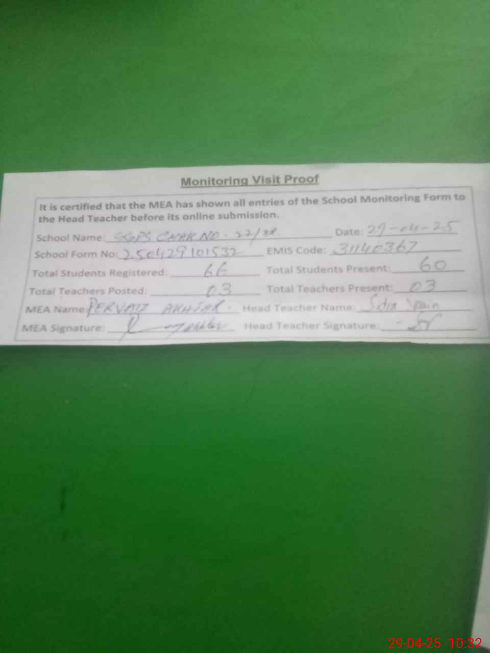 | Attendance Register | Head Teacher | MEA with School | Visit Proof |