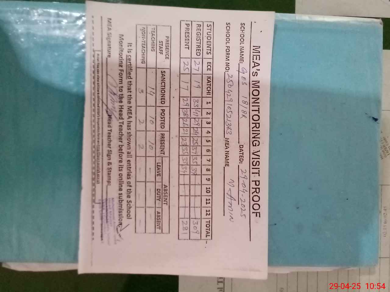 | Attendance Register | Head Teacher | MEA with School | Visit Proof |