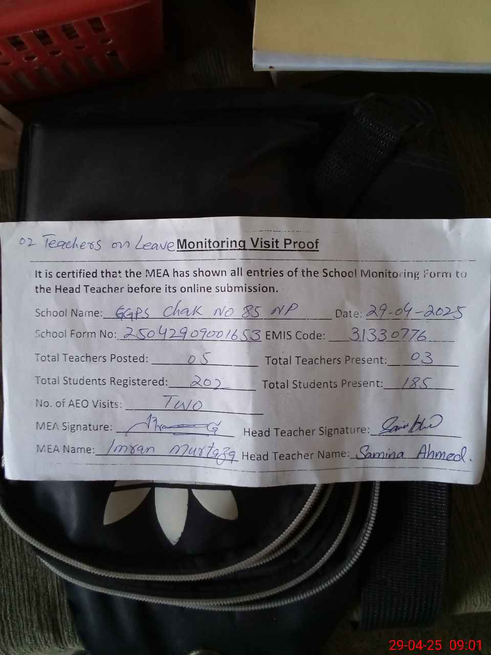 | Attendance Register | Head Teacher | MEA with School | Visit Proof |
