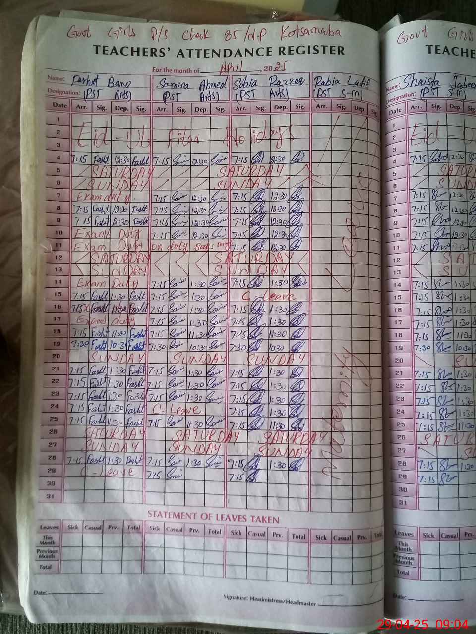 | Leave | Duty | Absent | Maternity | Medical | Ex- Pak |