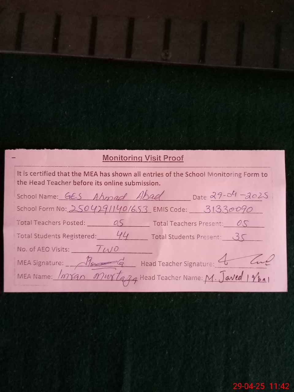 | Attendance Register | Head Teacher | MEA with School | Visit Proof |
