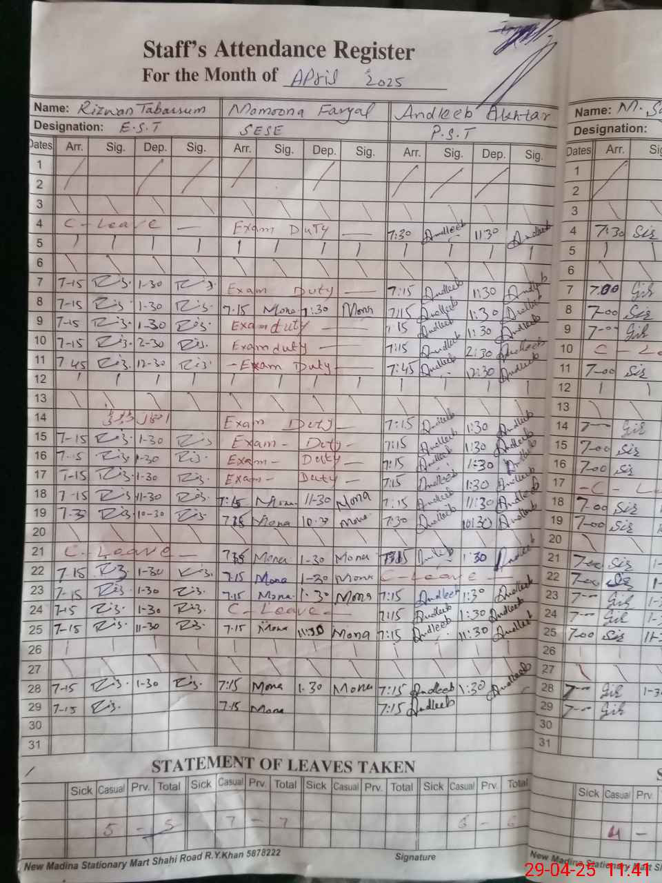 | CNIC | Full Name | Designation | R/C | Absence During Last Calender Month |