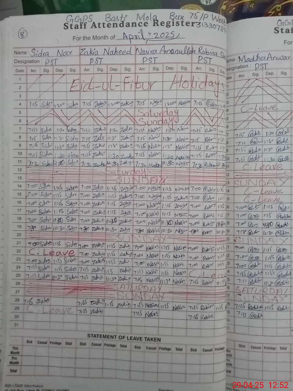 | Leave | Duty | Absent | Maternity | Medical | Ex- Pak |