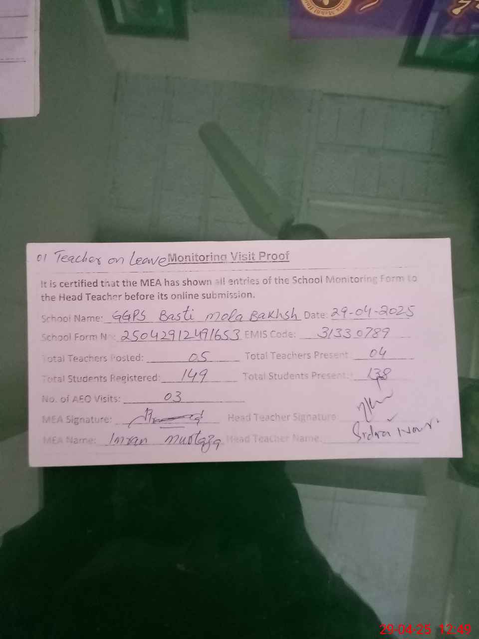 | Attendance Register | Head Teacher | MEA with School | Visit Proof |