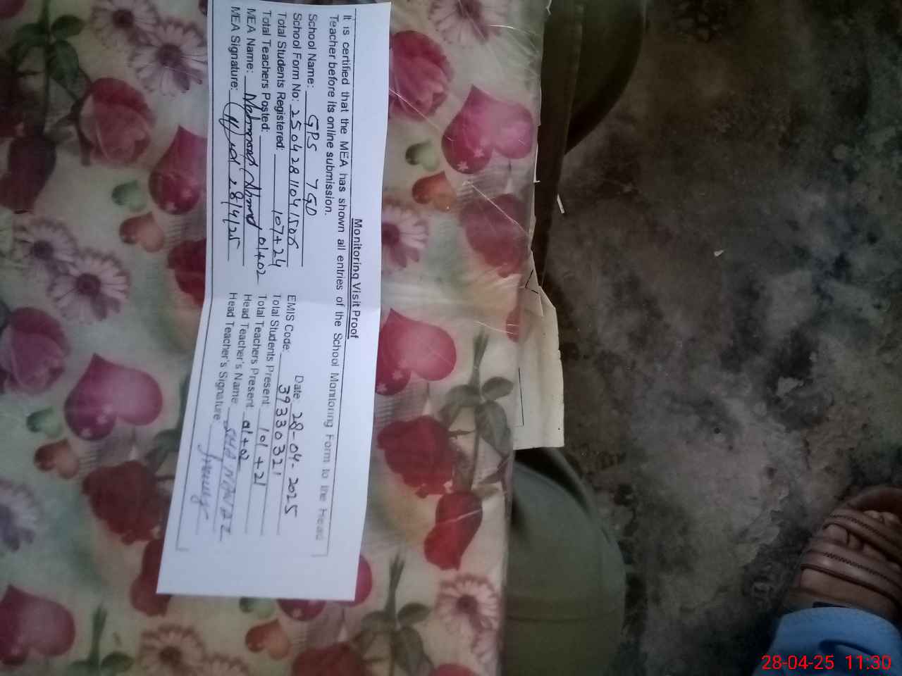 | Attendance Register | Head Teacher | MEA with School | Visit Proof |