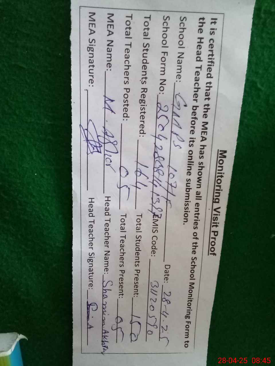 | Attendance Register | Head Teacher | MEA with School | Visit Proof |