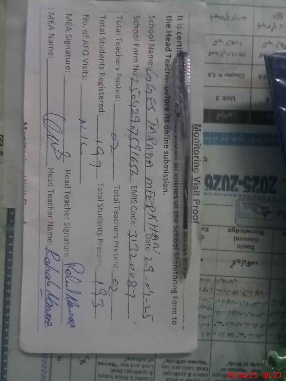 | Attendance Register | Head Teacher | MEA with School | Visit Proof |